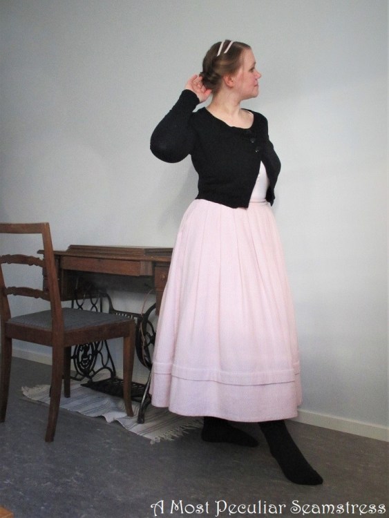 You know how sometimes you buy a fabric that you really like, but then it lives in your stash for years? That has happened to me more often than I‘d like to confess. When I first moved away from home I bought five metres each of cotton twills in pink, blue and sand colour. I made a dress and matching headband from part of the pink after a few years, and now I have used the rest of it to make a skirt. The blue and sand coloured material are still waiting for their moment to arrive.
