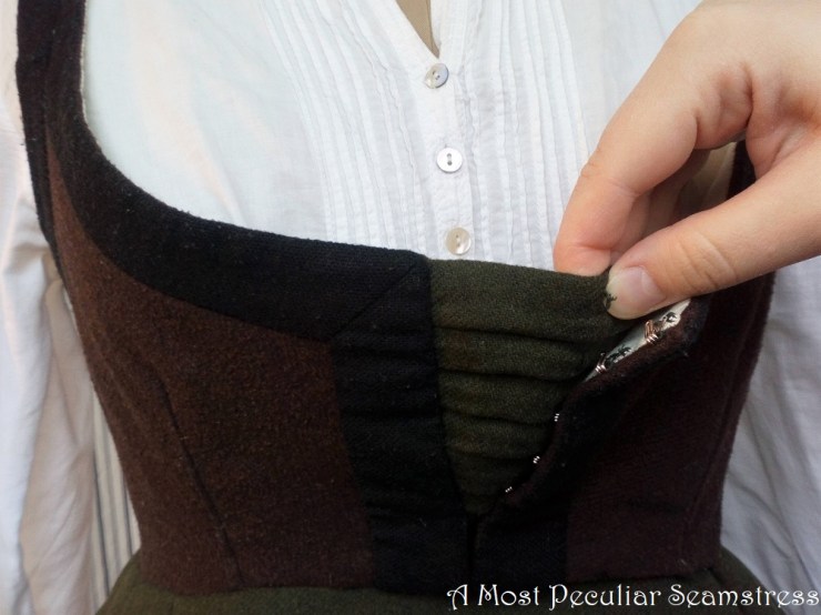 The biggest problem was the bodice being too tight, making me spill out of it. Breastfeeding can do that to a woman, and it’s not pretty. To sort this problem out, I made an insert of the same green wool as the skirt, pleated for visual interest. It’s stitched to one side of the bodice opening, but hooks down the other side.