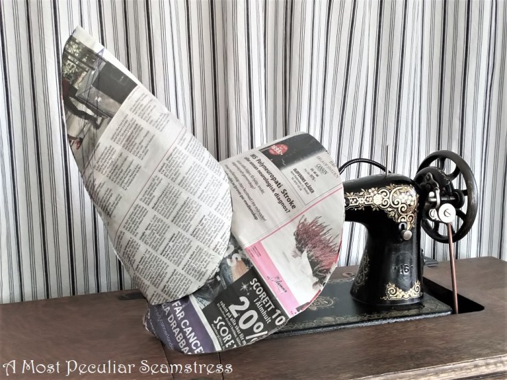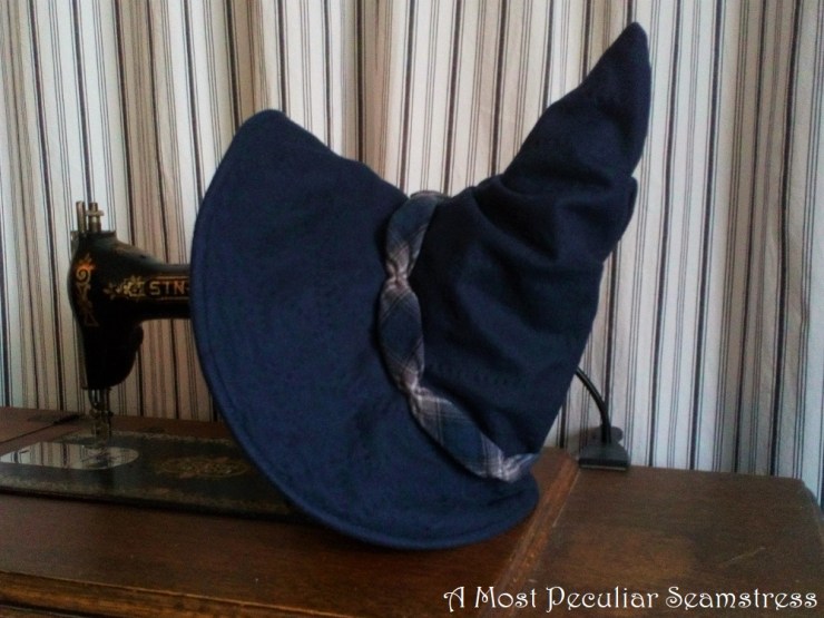 I love blue, so I knew that was the colour I wanted for my hat. I also love bonnets more than hats – they frame the face nicely – so I decided to do a witch’s bonnet, with a brim resembling those of the 1830’s, but with the typical pointy crown. I used wool, left over from making the Pre-Raphaelite Medieval-ish Dress for the outside, a cotton blend for lining the crown and cotton upcycled from an old dress as interlining. This was a no-buy project. First, I made a pattern from newspaper, and but for one or two small alterations it came out nearly perfect at the first try. Love it when that happens!