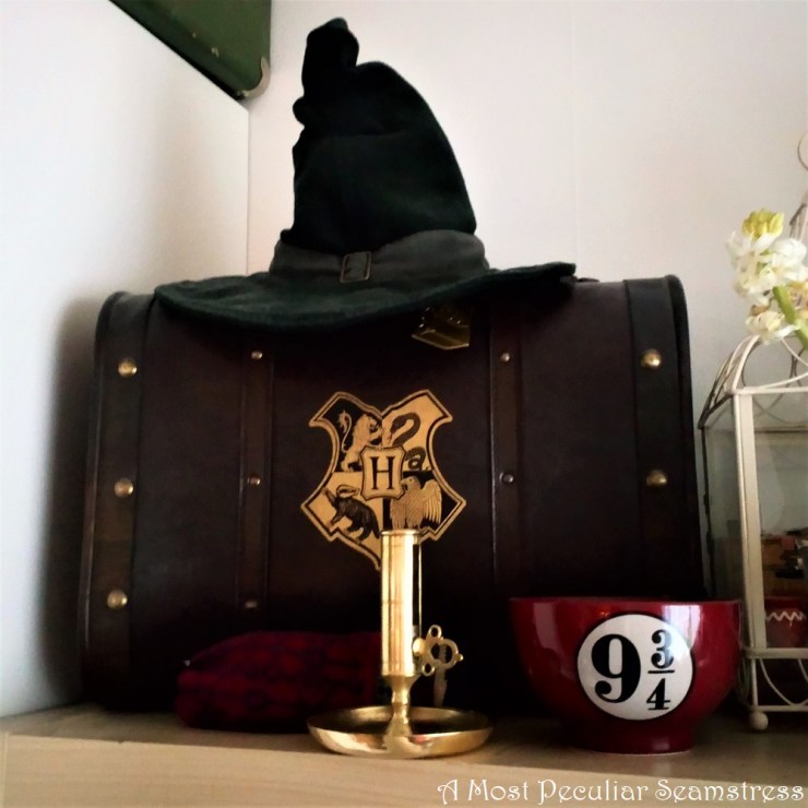 As you may know, I am a huge Harry Potter fan and like making witch costumes. Well, mostly it’s my real clothes that I combine in somewhat more witchy ways or add witchy details to. I’ve long been wanting a witch’s hat to wear and to display on my bookcase along with our other HP inspired things. I made a nice green witch’s hat a few years ago, but it didn’t fit so I gave it to my Mum – she loves green, and is at least as big a Harry Potter fan as I am, as you can tell by her display here.