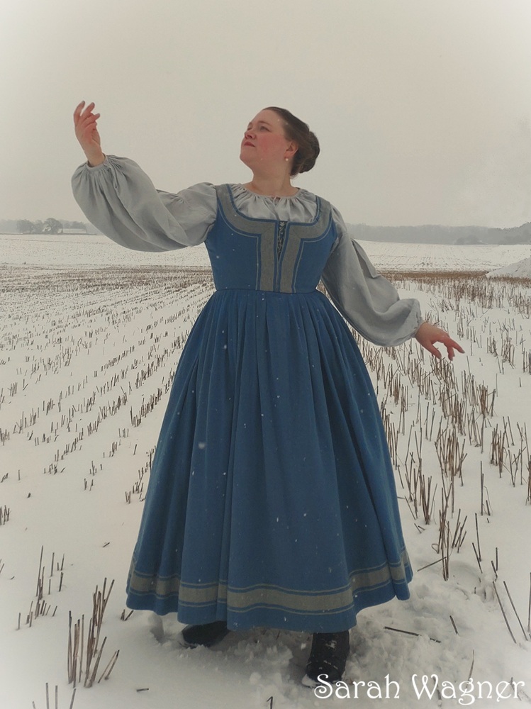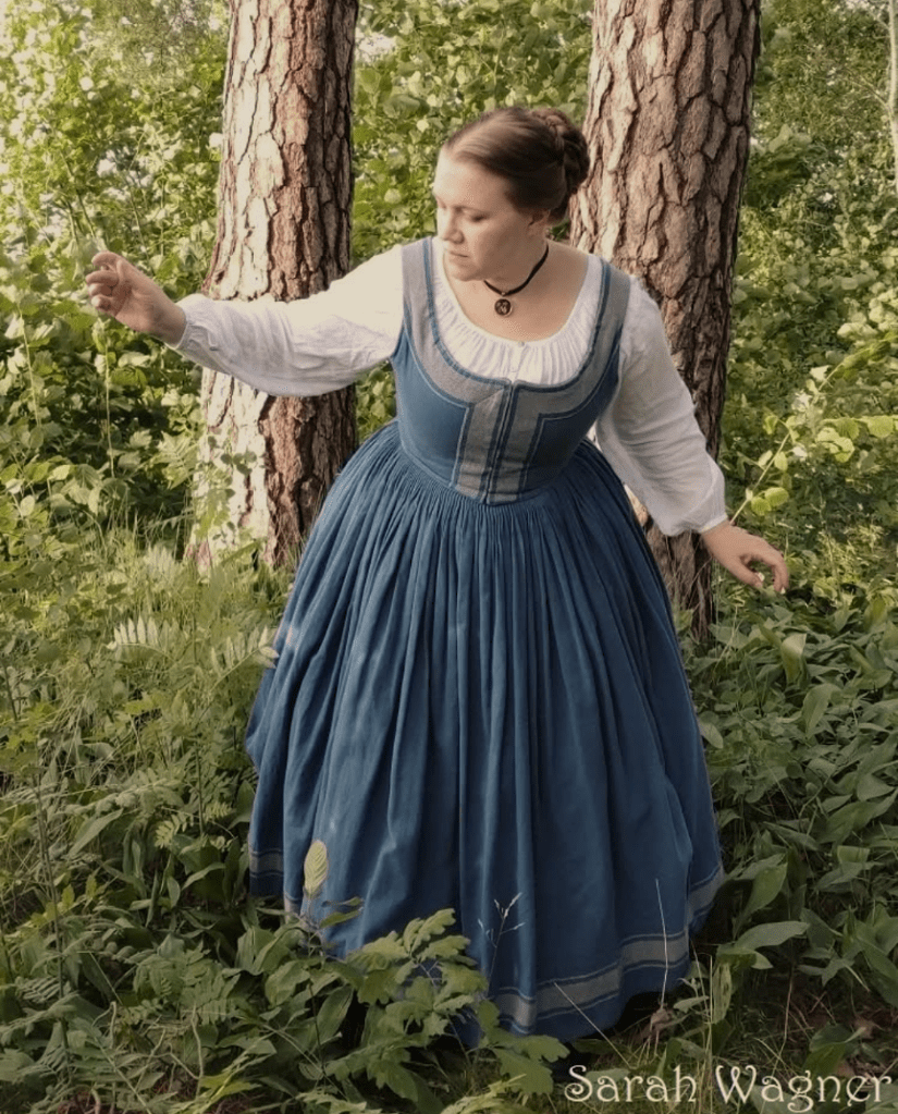 In 2021, I made a dress from IKEA tablecloths – a nice 50/50 cotton/linen blend with woven borders. I made it slightly reminiscent of 16th century kirtles, with no shaping but for front, back and side seams, and structure given by pad stitched interlining. It closed in front with hooks and eyes, and the skirt was cartridge pleated. Naturally, it had pockets. This was a historybound, not a recreation after all.