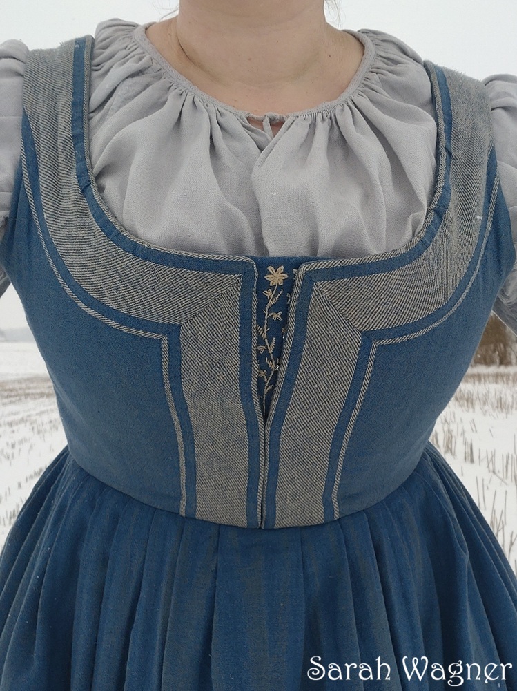 A year later, I added boning to the bodice, as I didn’t like how the interlining held up on its own. I also added trim to the neckline and fronts, and I liked it much better this way. I had half a plan to do trim on the bodice even when first making the dress, but wanted to wear it plain for a while first. That’s the nice thing about making your own clothes, the same garment can have several looks in its life.